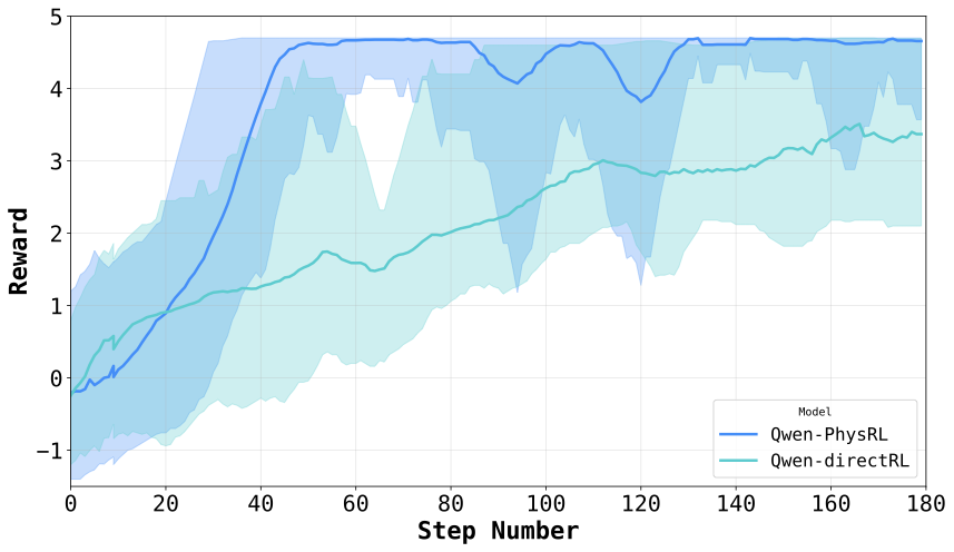 As shown in FigureĀ 2, Qwen-PhysRL exhibits substantially faster convergence and higher final rewards than Qwen-DirectRL under identical GRPO training configurations, highlighting the importance of a physics-aware initialization for RL. TableĀ 1 provides additional insight: the generic Qwen-Instruct backbone used in Qwen-DirectRL achieves higher rewards than the Qwen-Physics backbone used in Qwen-PhysRL during evaluation, indicating that general pretrained knowledge can partially compensate. However, despite this advantage, Qwen-Instruct fails to scale effectively under GRPO, exhibiting slower adaptation and early convergence to suboptimal policies. In contrast, the proposed two-stage approach consistently achieves superior performance across both Dynamic and Static settings.