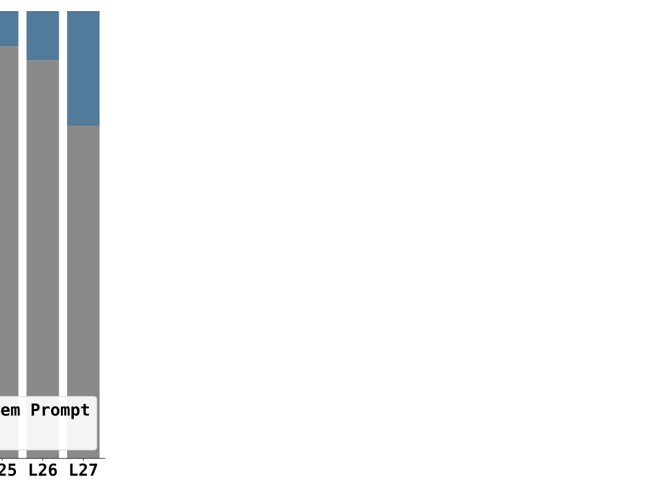 We then focus on the rows corresponding to the answer tokens, $`\text{AttScore}_l[|P \!\cdot\! M|:, :]`$, where each row represents the attention assigned to all prompt tokens during the generation of a specific output token. In the following, we summarize key observations derived from analyzing these attention patterns across layers.