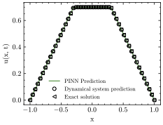 As a consistency check, we have run the discrete dynamical model for the viscous Burgers equation using the PINN weights and biases. Specifically, Eq.Ā [eq:chain_update] and Eq.Ā [eq:propagator] are used for the discrete time marching as shown here. The propagator for PINN $`(\omega=1)`$ becomes,