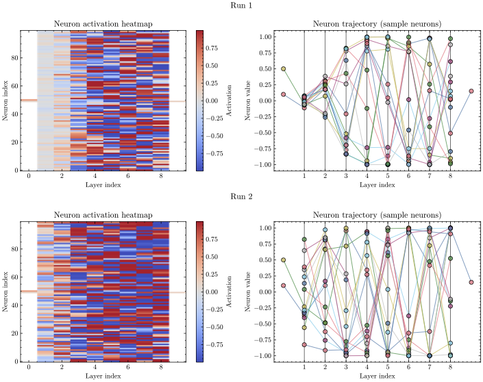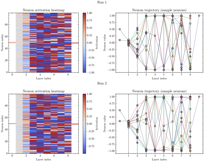 Despite the lack of diffusion in the problem, this network is able to learn the problem fairly well. It is still interesting to see that this small network which is about $`1/5`$ the size of the network used for the Burgersā equation both in depth and number of neurons per layer, still follows different paths to optimization. It can be observed in Fig.Ā 9 that a few specific neurons behave in significantly different ways across runs, guiding the system toward equilibrium. This seemingly special subset of neurons may be seen as an analogy to the so-called feature neuronsĀ , which play a key role in understanding how Large Language Models (LLMs) learn different concepts. It should be noted, however, that as also seen in Fig.Ā 9, these feature-like neurons are not unique and vary from run to run. Yet, basically the same equilibrium/local-minima is reached in both independent runs, when compared to the exact solution in Tab.Ā 2, again suggesting that no neuron is designated any functional uniqueness by the network depending on just the problem itself. In two different runs, different set of neurons are doing the stand-out tasks, characterized by higher activities in Fig.Ā 9. This reinforces the narrative of the existence of multiple paths to learning the same solution in dimensions far exceeding the original problem dimension.