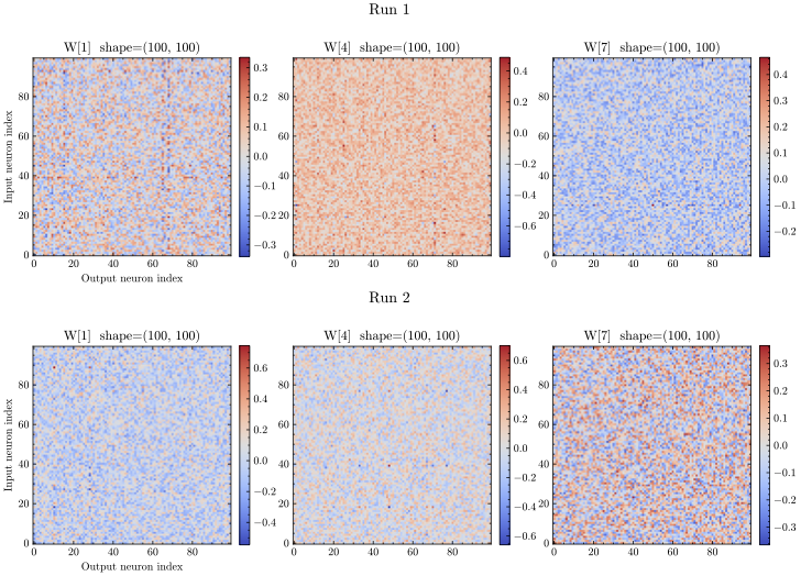 Furthermore, the activation function for the output layer is linear, $`f(z)=z`$, and no normalization is applied after each layer (normalization is however applied during the attention step of transformers using softmax functions). We first look at the weight matrices obtained from two different runs of the PINN, shown in Fig.Ā 3 that exhibit no interpretable similarity except the statistical nature (both following random generalized normal distribution as mentioned earlier.)