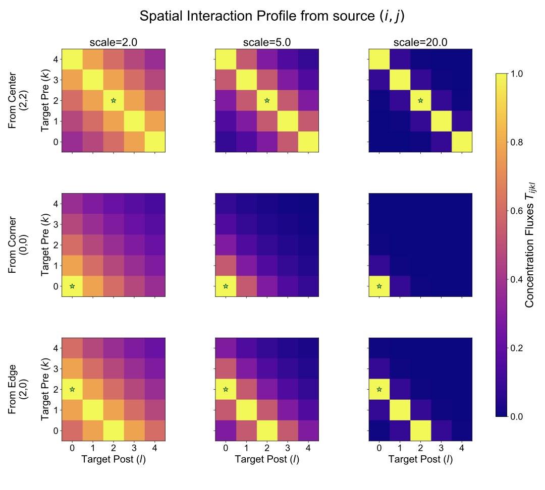 Visualizing slices of the $`T_{ijkl}`$ tensor helps to understand the spatial interaction profile from a specific source synapse $`(i, j)`$ to all possible target synapses $`(k, l)`$. Figure [fig:S_T_slices] shows examples for source synapses located at the corner, edge, and center of the $`5 \times 5`$ grid, for different values of $`\mathrm{scale}`$. Brighter colors indicate stronger influence (smaller distance or smaller $`\mathrm{scale}`$). Notice how the spatial extent of the influence changes significantly with the $`\mathrm{scale}`$ parameter.