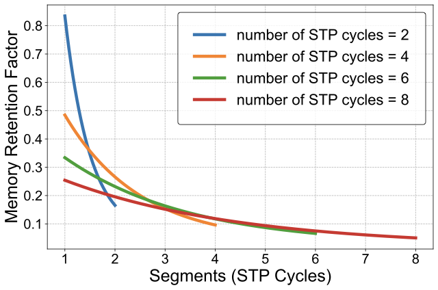 The determination of the factor begins by normalizing the total information capacityârepresenting the maximum integrated value the LTP state reaches at saturation (conceptually, the area under the dashed curve in Figure [fig:ltp_stp_dynamics] until it flattens)âto $`1`$ unit. We want to find out what fraction of this total capacity is contributed or updated by each segment (STP cycle). To determine this relationship generally, we can run simulations of the computational model assuming various anticipated total sequence lengths (i.e., total number of segments). For any given assumed total length (e.g., $`T`$ segments), we simulate the LTP dynamics and measure the increase in the LTP state during each segment $`t=1,2,...,T`$. We then express the increase during a specific segment $`t`$ as a fraction of the total normalized capacity ($`1`$ unit). This fraction yields the Memory Retention Factor for segment $`t`$ when the total anticipated sequence length is $`T`$. This process allows us to determine the retention factors for sequences of arbitrary anticipated lengths.