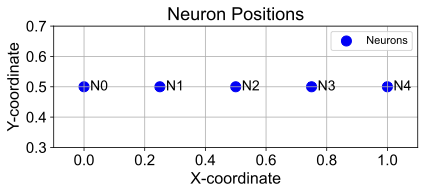 For simulation purposes, we first define the spatial layout of the neurons. For the example shown, we consider $`N=5`$ neurons arranged linearly in a 1D space, assigned coordinates for visualization (see Figure [fig:S_neuron_pos]). A synapse $`(i, j)`$ connects postsynaptic neuron $`i`$ and presynaptic neuron $`j`$. We define the spatial position of synapse $`(i, j)`$ as the midpoint between the coordinates of neuron $`i`$ and neuron $`j`$. This results in a grid of $`N \times N = 25`$ possible synapse locations for $`N=5`$ neurons (see Figure [fig:S_synapse_pos]).
