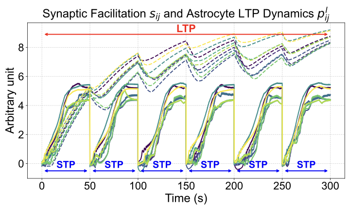 Long-Term Plasticity (LTP): To model slower processes related to modulating temporal information and memory consolidation, we consider the long-term astrocyte process parameter ($`p^l_{ij}`$). This variable integrates the effect of sustained synaptic activity ($`s_{ij}`$) over a significantly longer timescale ($`\tau_p^l > \tau_p^s`$), acting as a form of accumulating memory trace.