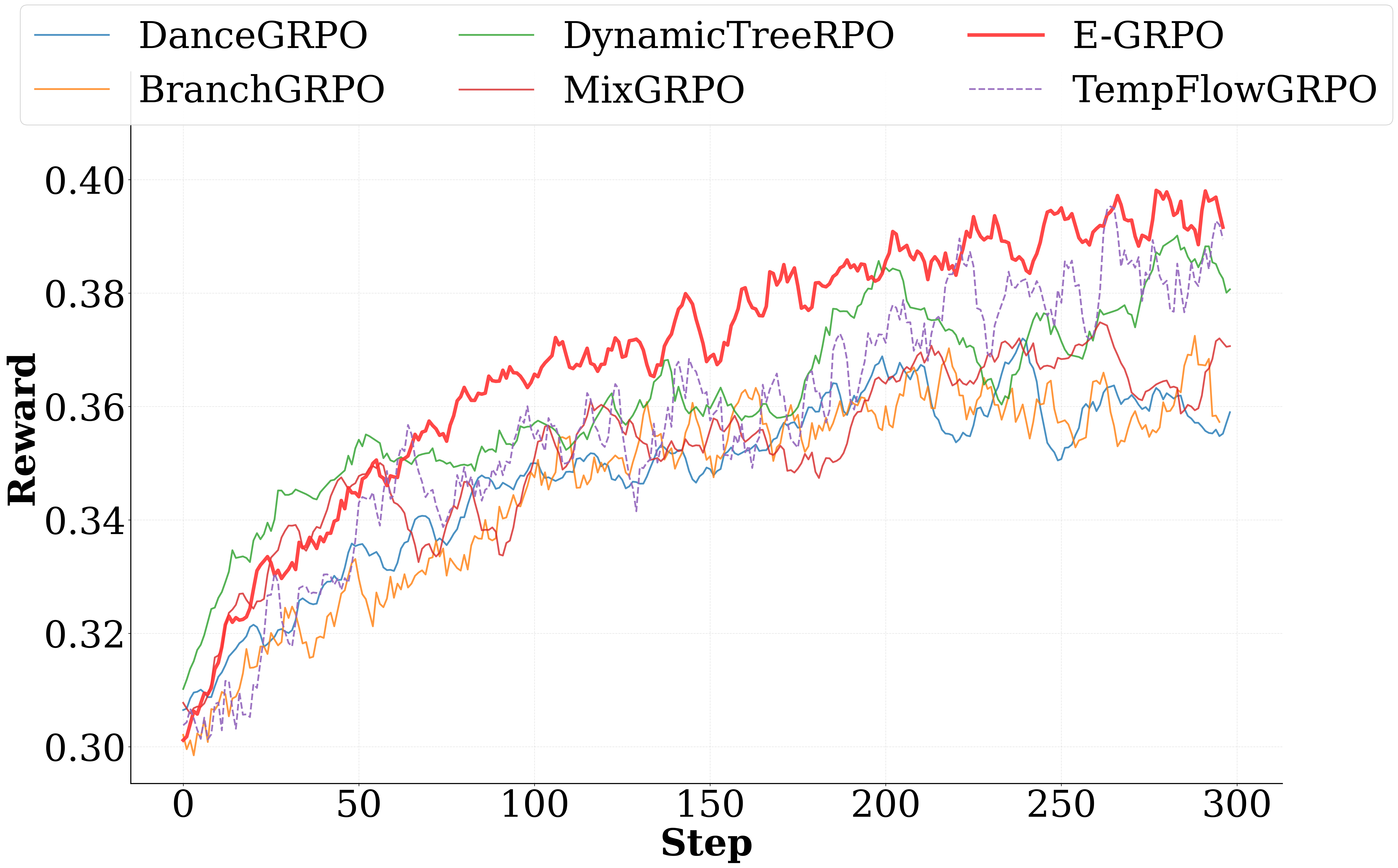 Figure 4 illustrates the reward trajectories during training. Compared with prior work, our method exhibits faster early-stage reward growth and smoother convergence, achieving a higher final reward. This indicates that the entropy-guided step selection stabilizes optimization by focusing updates on the most informative denoising steps, improving both efficiency and reliability.
