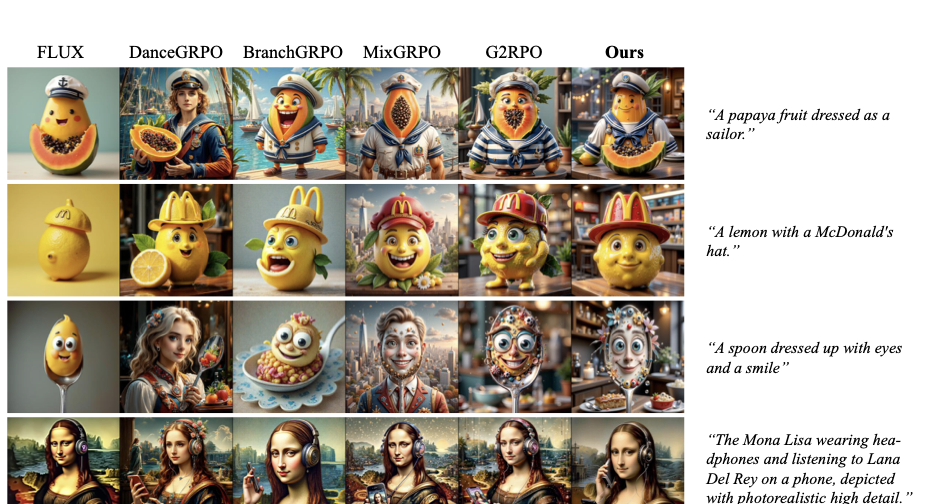 Figure 5 presents qualitative comparisons among FLUX.1-dev, DanceGRPO, BranchGRPO, MixGRPO, G2RPO, and our proposed E-GRPO. As shown in the first row (prompt: “A papaya fruit dressed as a sailor”), E-GRPO generates a composition that naturally integrates the papaya’s structure with human-like attire, yielding images of higher aesthetic quality and greater realism. In contrast, baseline methods either misinterpret the prompt (e.g., DanceGRPO generates a person holding a papaya) or produce visually incoherent results (e.g., MixGRPO and G2RPO). In the third row (prompt: “A spoon dressed up with eyes and a smile”), E-GRPO produces expressive and visually consistent humanized faces while preserving the metallic texture of the spoon, whereas other methods generate unrealistic facial blending or lose material fidelity. These results highlight that E-GRPO achieves superior semantic grounding and visual coherence, leading to images that more faithfully reflect textual intent and human aesthetic preference.