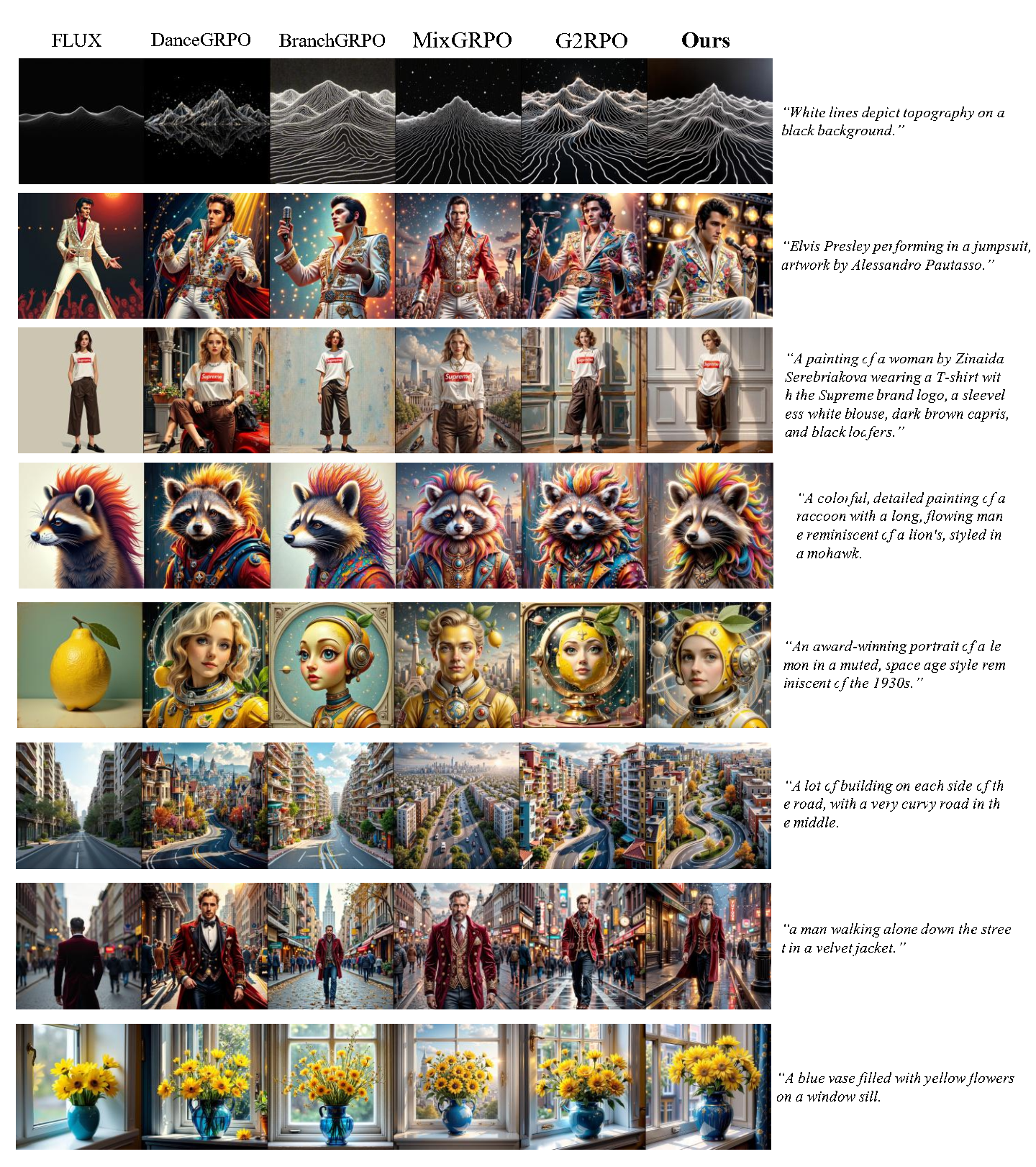 To further demonstrate the superiority of our proposed E-GRPO, we provide additional qualitative comparisons with baseline methods in Figure 6 and Figure 7. As illustrated in these figures, E-GRPO consistently produces results that are more faithful to the text prompts. For example, under the prompt “ An award-winning portrait of a lemon in a muted, space age style reminiscent of the 1930s.” E-GRPO successfully generates a portrait that combines a space-age aesthetic with the intended compositional structure. Likewise, for the prompt “A lot of buildings on each side of the road, with a very curvy road in the middle.” our method captures the “curvy” characteristic more accurately and achieves higher aesthetic quality compared with baseline methods. These results further validate that by focusing on high-entropy steps, E-GRPO enables more effective exploration and better alignment with complex human preferences.