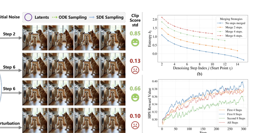 Despite these advancements, existing GRPO-based methods apply policy optimization across multiple denoising timesteps, resulting in sparse and ambiguous reward signals that hinder effective alignment. We observe that only high-entropy timesteps contribute meaningfully to training dynamics. As shown in Figure 1 (b), stochastic exploration via SDE at timesteps with higher noise level possess larger entropy. We visualize the generated images under different circumstances, where high-entropy timesteps yield diverse images with distinguishable reward variations, while low-entropy timesteps produce less reward differences, which are similar to those induced by adding 10% random noise to the final image. This phenomenon implies that reward models struggle to discern subtle trajectory deviations in low-entropy regimes. Furthermore, we implement GRPO with SDE sampling on four settings: (i) the first 4 timesteps, (ii) the first 8 timesteps, (iii) the second 8 timesteps, and (iv) all 16 steps. Notably, optimization on the first half timesteps performs even better than on all timesteps, which indicates that the second half timesteps are largely uninformative.