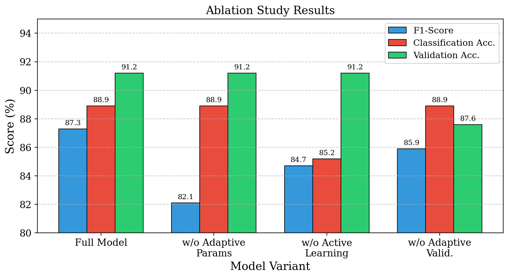 We conduct systematic ablation experiments to quantify the contribution of each core component in ACCD. The full model achieves the highest F1-score of 91.2%, together with strong classification accuracy (88.9%) and validation accuracy (87.3%). Removing the adaptive parameter mechanism results in the most pronounced degradation in F1-score, underscoring its critical role in optimizing detection performance across diverse coordination patterns. Excluding the active learning module leads to a substantial reduction in classification accuracy, highlighting its importance for effective sample selection and model refinement. Similarly, disabling the adaptive validation strategy causes a clear decline in validation accuracy, confirming its necessity for robust generalization and resistance to overfitting. Overall, these results demonstrate that each component of ACCD is indispensable to the effectiveness of the proposed framework.