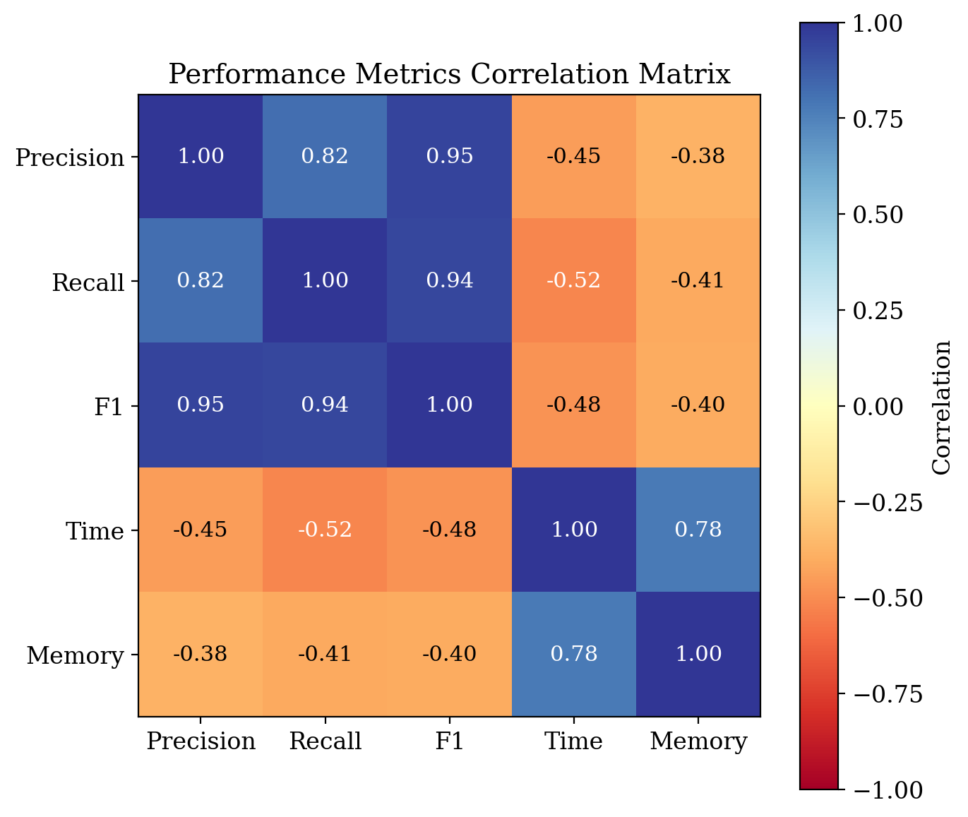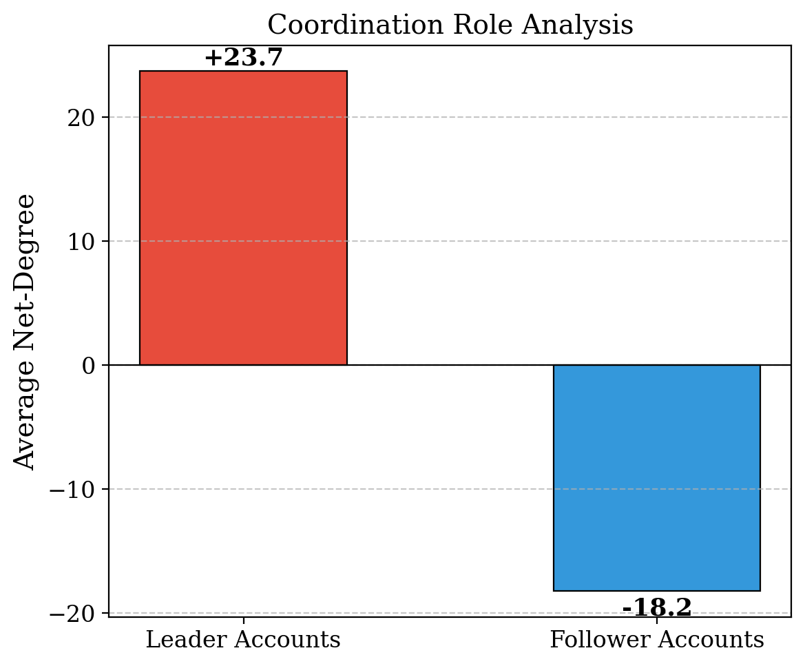 Structural Insight into Coordination Campaigns. ACCD provides fine-grained analytical capabilities for campaign forensics. Network role analysis reveals clear structural differentiation within coordinated campaigns. Leader accounts exhibit a high average net-degree (+23.7), indicating strong outbound influence, whereas follower accounts show a negative net-degree (-18.2), reflecting high in-degree and receptive behavior. In addition, correlation analysis among evaluation metrics reveals strong positive correlations (0.82ā0.95) between precision, recall, and F1-score, confirming that detection improvements are holistic rather than metric-specific. These accuracy gains are accompanied by moderate negative correlations with time and memory usage, highlighting the inherent trade-off between performance and computational cost.