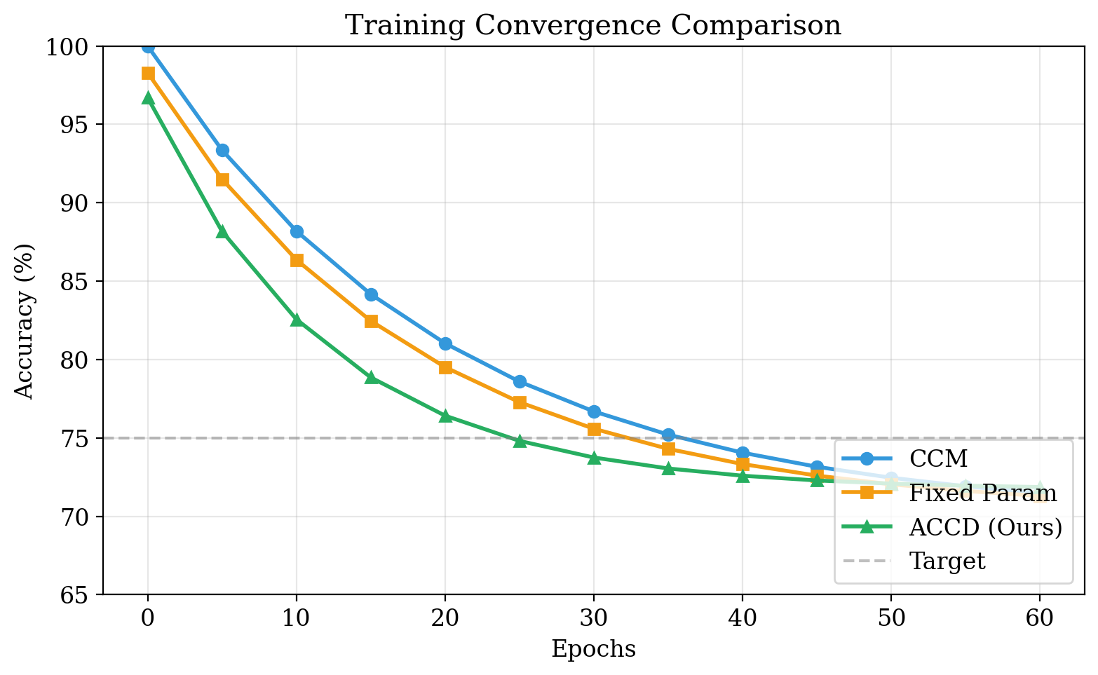 Computational Efficiency. ACCD also demonstrates substantial improvements in computational efficiency, as detailed in TableĀ 2 and FigureĀ 5. In terms of convergence behavior, ACCD requires only 40 training epochs to reach optimal performance, compared to 65 epochs for CCM and 58 epochs for the fixed-parameter variant. This represents a 38.5% reduction in training epochs, enabling faster model iteration and deployment.