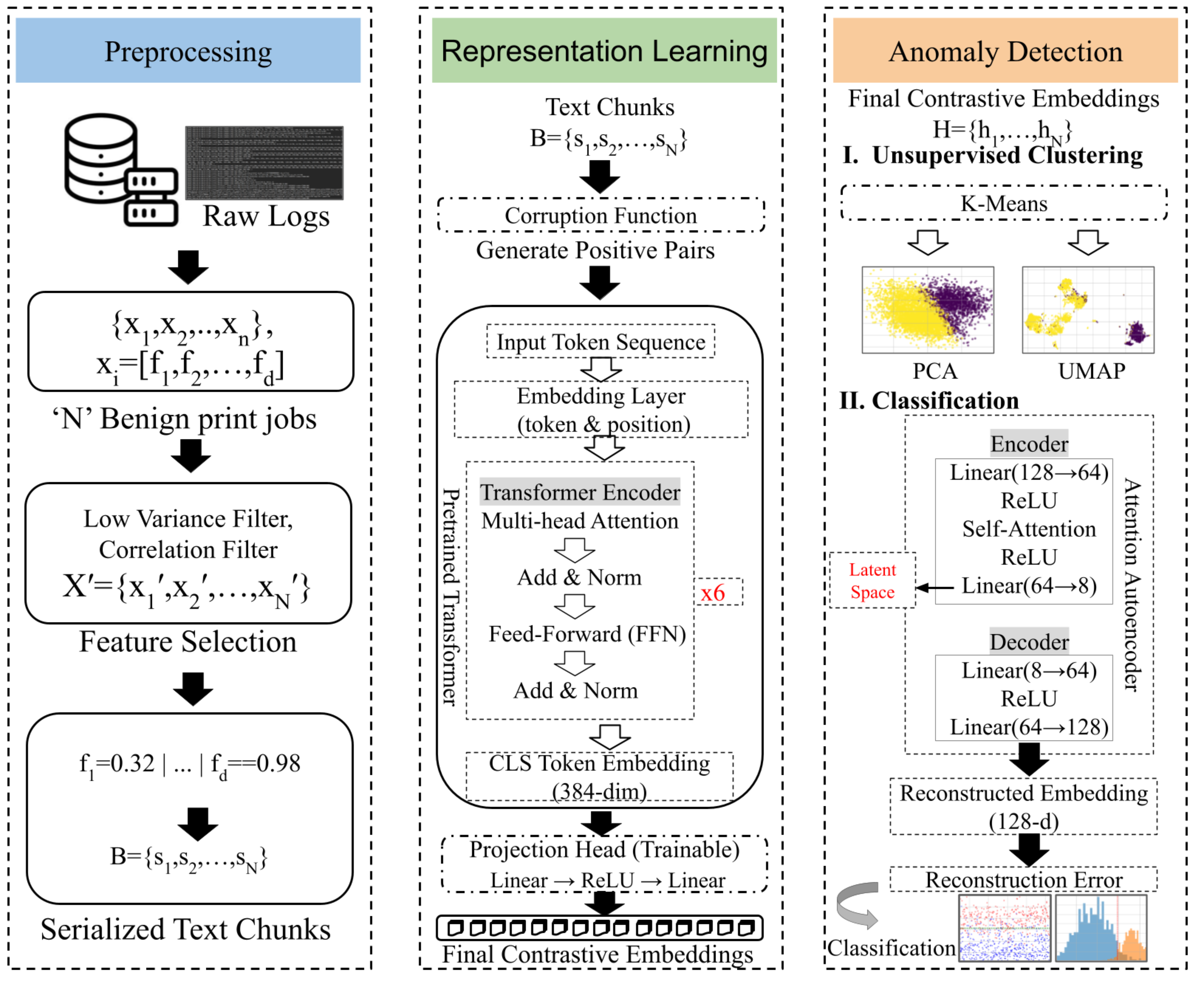 Inference and Anomaly Detection: At inference time, unseen printer logs are serialized and passed through the frozen encoder $`f_\theta`$ and the trained projection head $`g_\phi`$ to generate compact embeddings: $`\mathbf{z}_i = g_\phi(f_\theta(s_i)).`$ These embeddings serve as inputs to two complementary anomaly detection strategies: