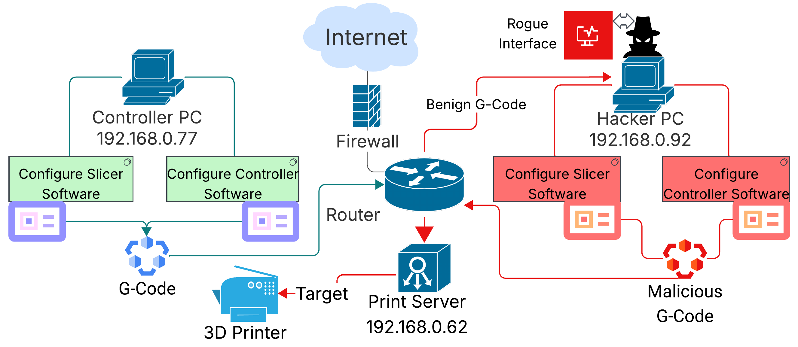 Intellectual Property (IP) Theft. With access to the printerās file system, the adversary can exfiltrate proprietary design assets such as uploaded G-code files or STL derivatives. These files can be intercepted before or after any modifications and covertly transmitted to an attacker-controlled server. Once obtained, the files can be reverse-engineered to extract valuable manufacturing information such as pathing logic, infill strategies, or fine-tuned process parameters. Furthermore, the stolen files may be replicated on remote 3D printers to produce counterfeit copies of the original design. Such breaches are especially damaging in high-stakes sectors like aerospace, biomedical devices, or defense manufacturing, where the leakage of proprietary IP can result in significant strategic and economic consequences.