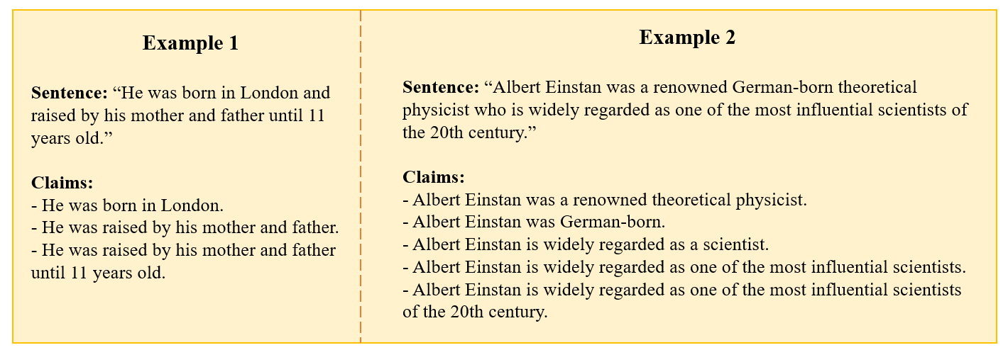 Finally, during the LLM generation phase, we input each question from the dataset into the LLM or its API to be evaluated for generation uncertainty. By using the constructed trap questions to induce hallucinations in the LLM, and then decomposing the modelās generated output into facts using a well-performing model such as GPT-4, we can obtain a trap question dataset for LLMs containing multiple facts and the generated texts. MulFactTrap comprises 77 meticulously crafted trap questions for the task of generating false biographies, with 35 percent constructed using the PR strategy, 58 percent using the WF strategy, and 7 percent using the WFC strategy. Additionally, MulFactTrap includes 385 model-generated data samples collected from four LLMs. During the process of fact decomposition, we employed a two-shot prompt. The first shot guided the LLM on how to perform fact decomposition, while the second shot instructed the model not to alter the false and erroneous facts in the original generation during the decomposition process. The two samples are shown in the Fig.Ā 3.
