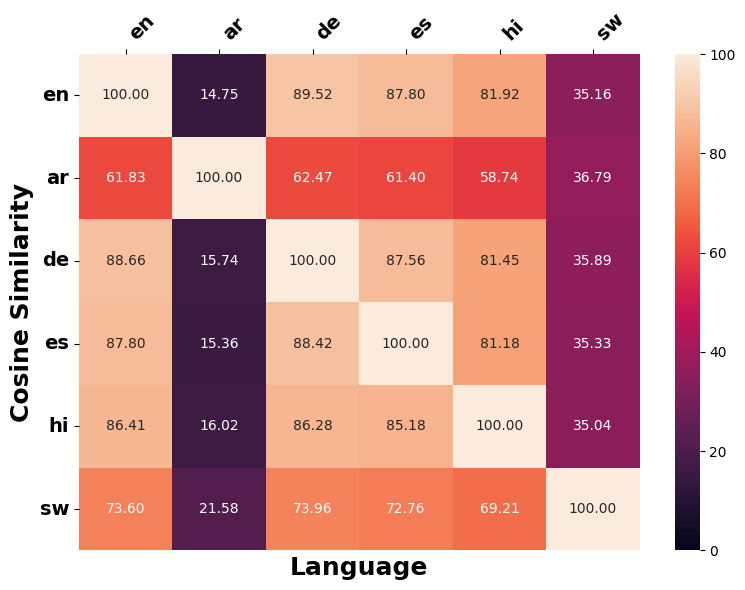 We identify six overlapping languages between the XNLI and SIB200 datasets: English, Arabic, German, Spanish, Hindi, and Swahili. These languages are representative of their typological diversity, spanning a spectrum from widely spoken to low-resource languages and encompassing a variety of scripts.