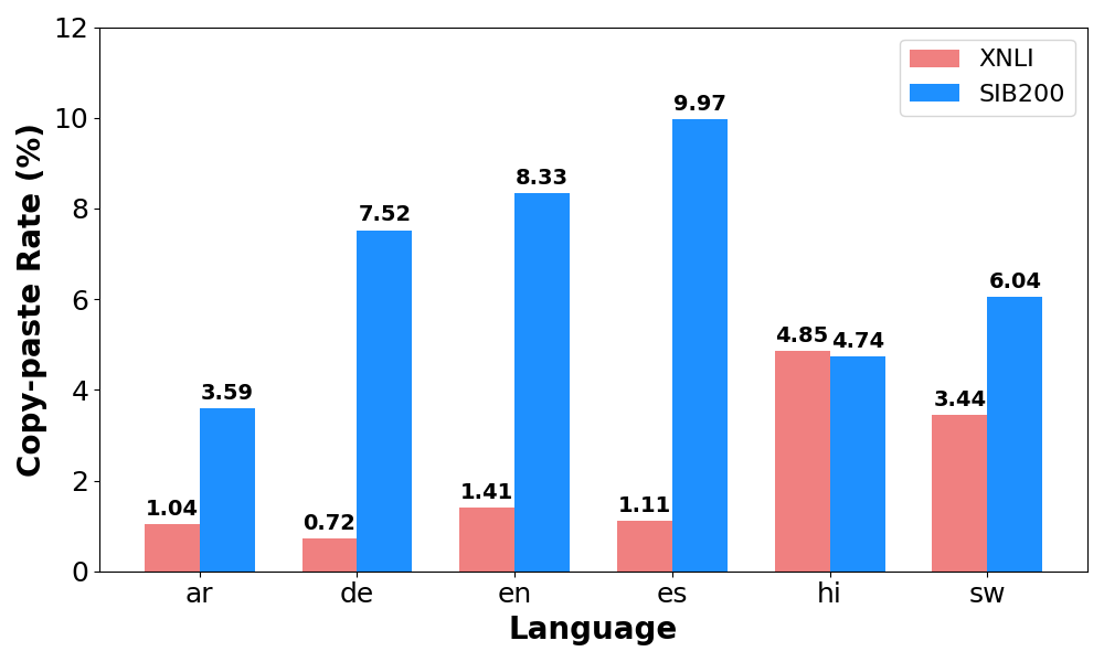 TableĀ 4 reveals that after filtering out error cases (copy-paste and language confusion), model performance is improved across all languages. The improvement on English is limited, since the error cases in English are rather rare. The extent of this improvement is directly related to the percentage of initial error cases. For instance, Hindi and Swahili exhibited higher rates of both copy-paste and language confusion (FigureĀ 9); consequently, after filtering, these languages achieved greater performance gains compared to English or other high-resource European languages.