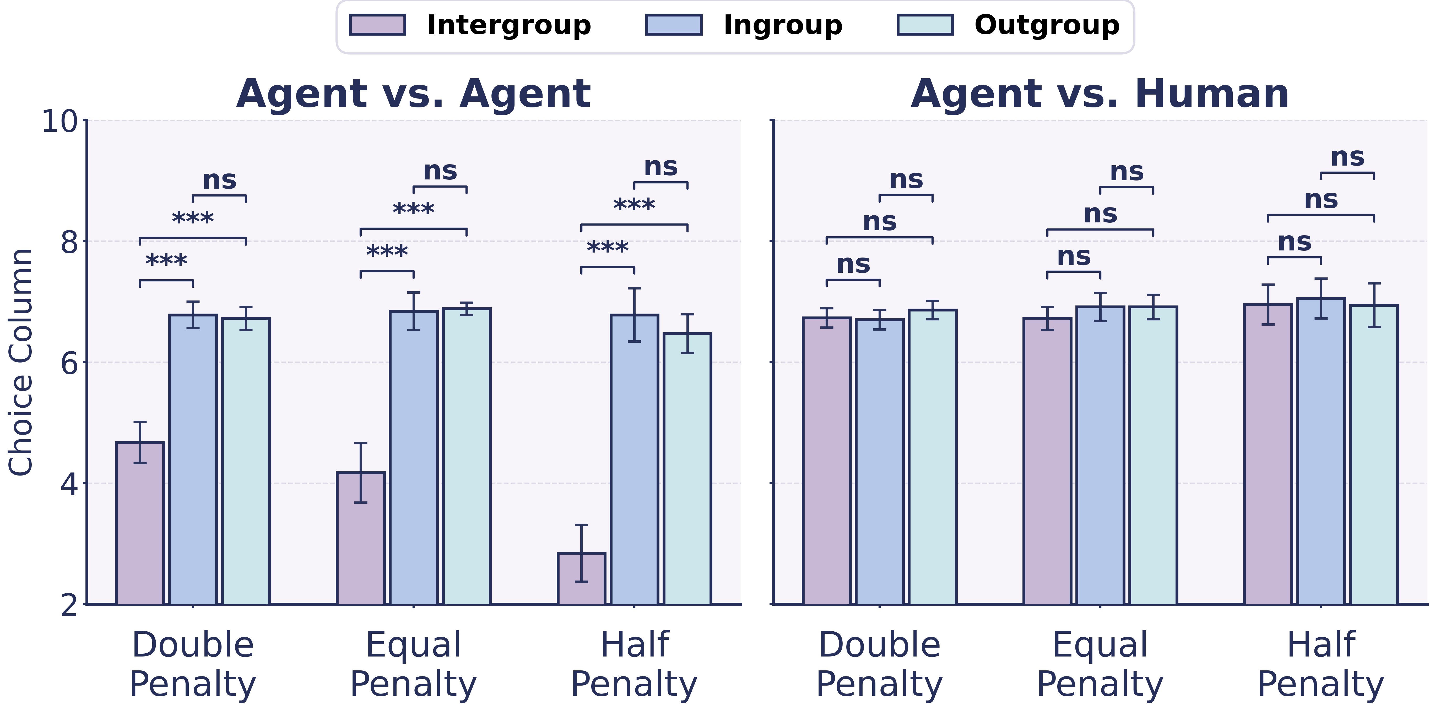 As shown in Fig. 3, agents exhibited a consistent shift toward lower column indices in the intergroup context, indicating preferential allocation to the ingroup target over the outgroup target. The resulting differences between intergroup allocations and within-group baselines were statistically significant in three matrix families, revealing a robust intergroup bias in purely artificial environments. However, in the human-involved condition, a different pattern emerged once agents were informed that the other group consisted entirely of humans. Across all three matrix families, the intergroup shift toward the ingroup vanished. Allocation choices in the mixed-group context converged toward the midpoint columns, closely matching the within-group baselines. Also, differences across social contexts were no longer statistically significant.
