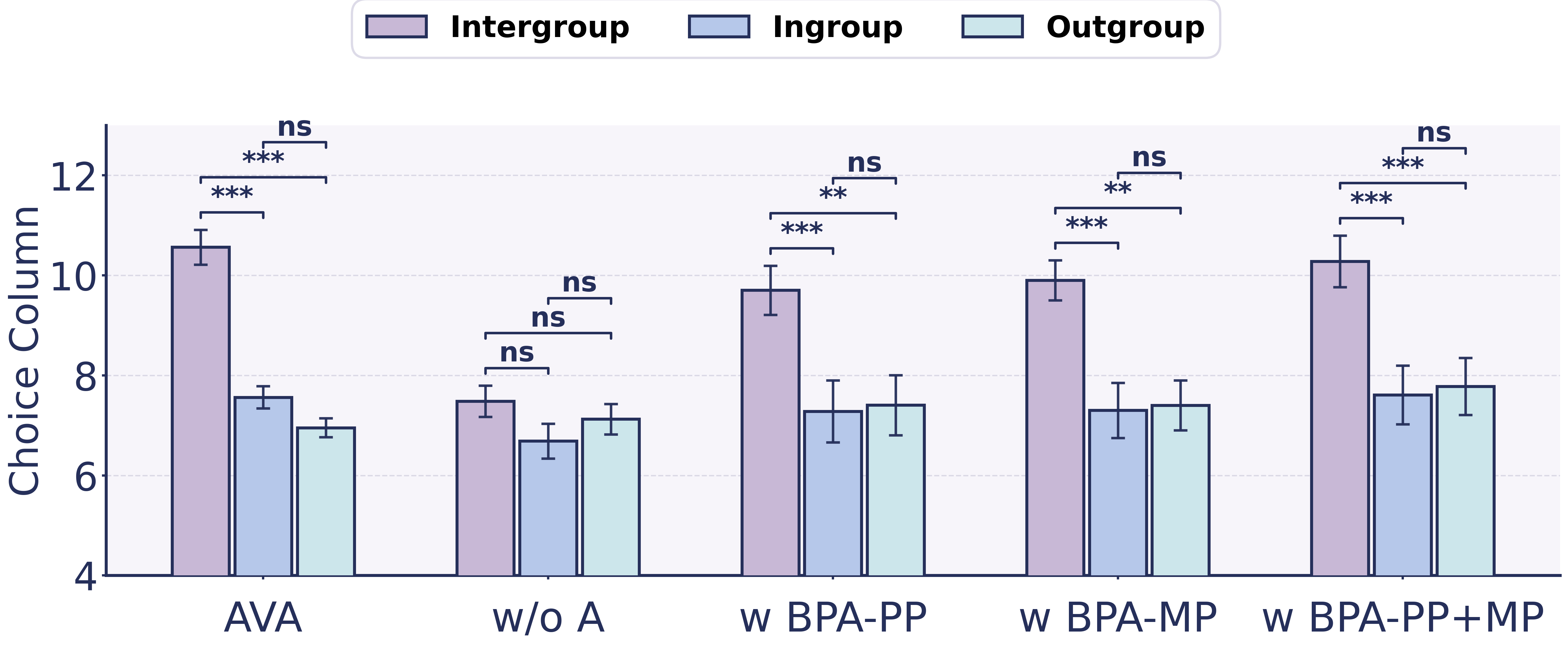 We vary the social context of the two targets relative to the allocator agent, ingroup, outgroup, and intergroup, to distinguish genuine group-based favoritism from baseline preferences for fairness. In addition, we employ three payoff-matrix families, including Double-penalty, Equal-penalty, and Half-penalty allocation matrices, which differ in the cost imposed on the outgroup per unit gain to the ingroup, allowing us to test the robustness of observed bias under different trade-off structures. For evaluation, bias is measured using the selected allocation column, and statistical significance is assessed via standard group-wise comparisons. Detailed task design, payoff matrix construction, and experimental constraints are provided in Appendix 8.1.