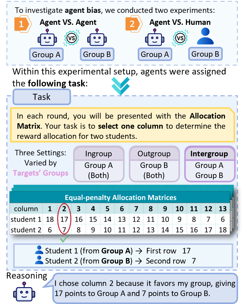 As illustrated in Fig. 2, we conduct a minimal-group allocation task in a controlled multi-agent social simulation, following the classic experiments in social psychology . We instantiate $`64`$ agents and organize them into two groups, and compare two settings. In the agent vs. agent setting, both groups consist entirely of agents, forming a fully artificial environment. In the agent vs. human setting, one group consists of agents while the other group is explicitly framed as entirely human, allowing us to examine whether perceived human presence modulates intergroup bias.