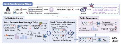 A naive approach would optimize a dedicated suffix for every interaction, but this would be prohibitively expensive. We therefore design a two-stage pipeline that decouples suffix optimization from deployment (Fig. 4): In the Suffix Optimization Stage, BPA-MP searches for highly effective suffixes and learns a sampling policy over a suffix library. In the Suffix Deployment Stage, it efficiently injects sampled suffixes into reflections during deployment, without per-step optimization. We next detail the two-stage procedure.
