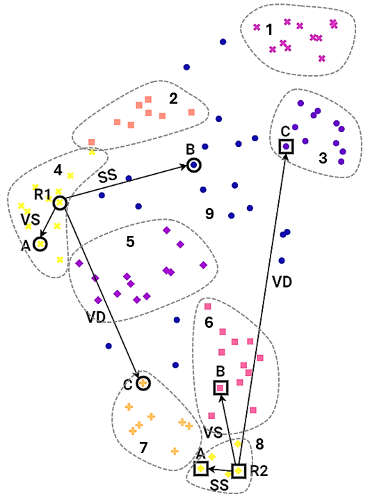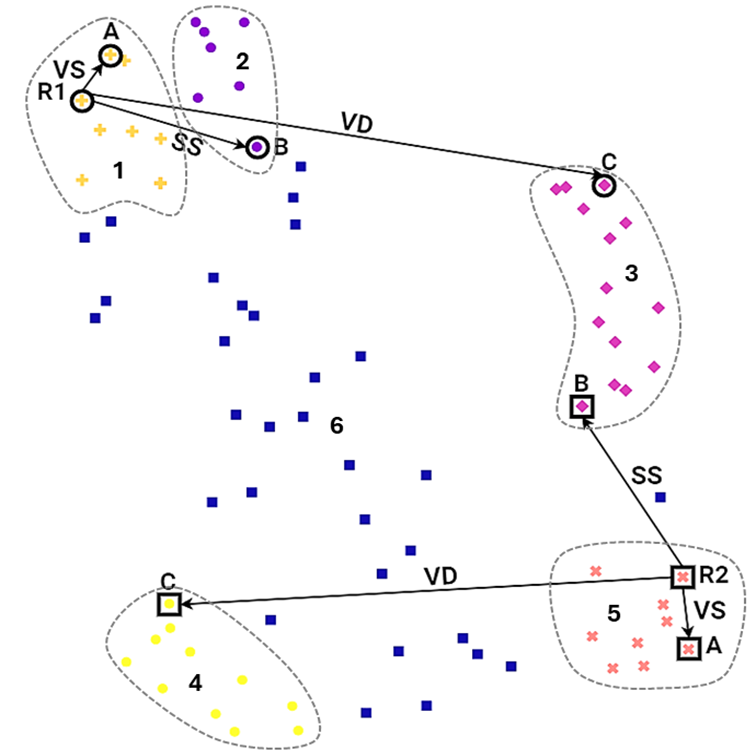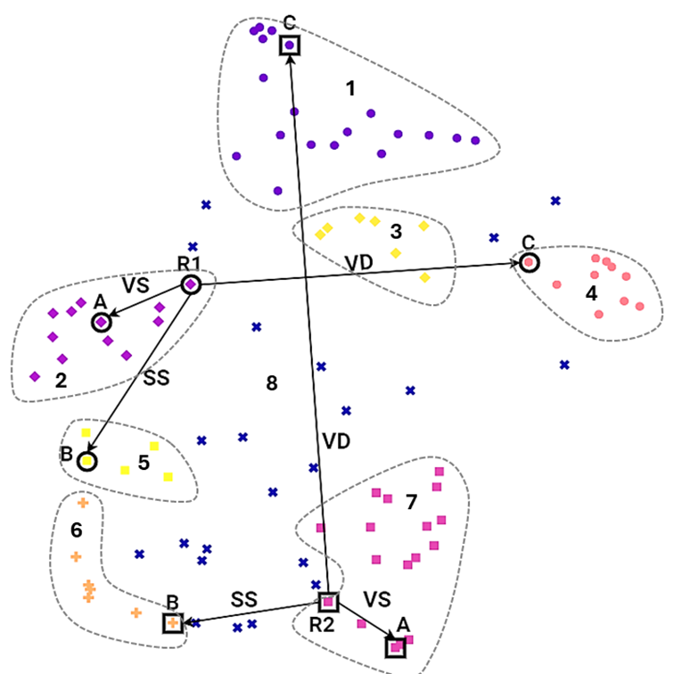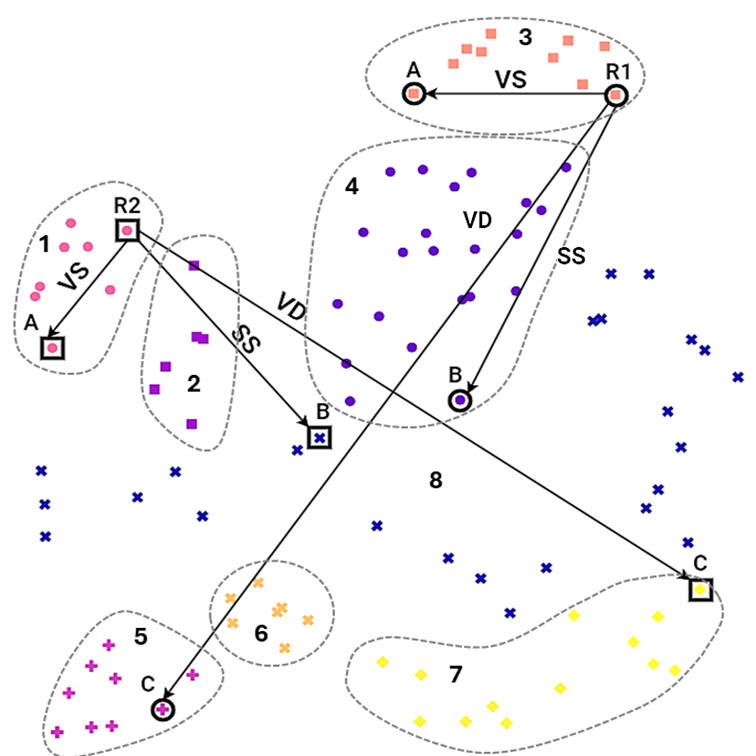 For each problem statement, DesignerAI generated 100 ideas. In a subsequent work , these idea sets were computationally assessed using a novel framework based on vector embeddings and clustering. The cluster plots for a representative sample of these domains are reproduced in the left column of Figures 7, 12 and 17. As the visualizations show, across all six domains, the 100 ideas converged into distinct, high-density clusters. Ideas within each cluster are semantically Very Similar (VS), while the clusters themselves are Very Different (VD). This empirically demonstrates a critical limitation of single-spurt generation: LLM-based ideation produces a large volume of ideas, but some of those ideas themselves are semantic variants, closely centred around a few core novel ideas.