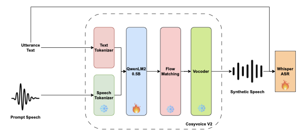 CosyVoice is trained in two stages: the speech tokenizer learns from approximately 200k hours of aligned Chinese-English audio, while the full TTS model is trained on an additional 167k hours spanning four languages: Chinese, English, Japanese and Korean. This scale and diversity allow CosyVoice to generate natural, speaker-consistent speech, including fluent intra-sentence code-switching, making it a practical source of synthetic data for strengthening multilingual ASR systems.