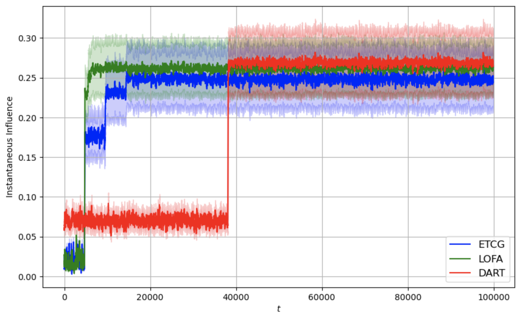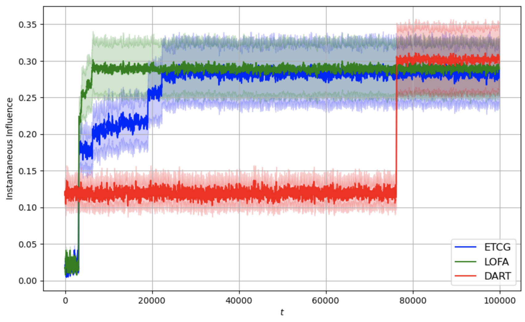 $`= 100`$. In the graph, LOFA is in green, ETCG is in blue, and DART is