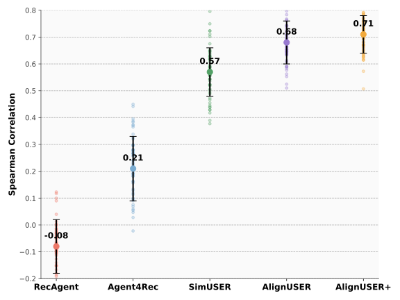 Baselines We compare AlignUSER against RecAgent , Agent4Rec , and SimUSER which represent the closest comparable methods. Some experiments involve two versions of AlignUSER: AlignUSER and AlignUSER+, in order to isolate the effects of pretraining and few-shot prompting. When possible, we also report the results of RecMind , an agent-based RS.