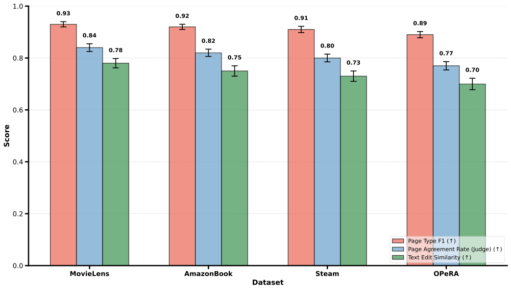 cart), (ii) page agreement rate ($`\uparrow`$): a judge model assesses