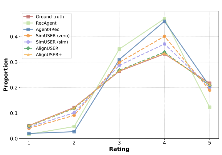 Beyond individual rating alignment, human proxies must replicate real-world behavior at the macro level. This implies ensuring that the distribution of ratings generated by the agents aligns closely with the distributions observed in the original dataset. FigureĀ 5 presents the rating distribution from the MovieLens-1M dataset and the ratings generated by different simulators. These results reveal a high degree of alignment between the simulated and actual rating distributions, with a predominant number of ratings at 4 and a small number of low ratings (1ā2). While RecAgent and Agent4Rec assign fewer low ratings than real users, SimUSER reduces this mismatch, and AlignUSER and AlignUSER+ come closest to the true distribution.