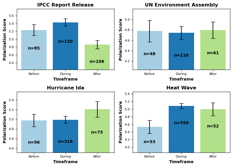 In this section, we analyzed discussions surrounding major climate change-related events as one of the case studies for the current research. Specifically, we examined how affective polarization levels fluctuate before, during, and after four key climate-related events: the Intergovernmental Panel on Climate Change (IPCC) assessment report release, the United Nations (UN) Environment Assembly, Hurricane Ida and a major heatwave. To provide a structured overview, TableĀ 1 presents the starting and ending timeframes of the considered events. For each event, we computed the mean affective polarization scores and the standard errors across all conversations before, during, and after the event. The results are illustrated in FigureĀ 2. As shown in the figure, affective polarization scores increase noticeably during and after these events compared to the preceding period. This aligns with expectations that major climate-related developments amplify emotional intensity in public discourse. Additionally, the volume of conversations (denoted by ānā in the figure) also significantly increases during and after these events, reflecting heightened social media interactions.