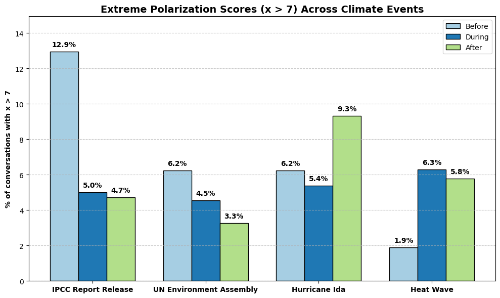 To better understand the intensity of polarization, we focused exclusively on conversations exhibiting extreme polarization (scores greater than 7). FigureĀ 3 shows the percentage of highly polarized conversations during different timeframes (before, during, and after) for each climate-related event. The analysis reveals distinct patterns: well-publicized events such as the IPCC assessment report release and the UN Environment Assembly displayed heightened extreme polarization primarily before these events, reflecting anticipation and ideological engagement. Conversely, unpredictable climate events like Hurricane Ida and the heatwave experienced spikes in extreme polarization predominantly during and after the events, highlighting the role of spontaneous emotional responses and reactive discourse in shaping polarization patterns.