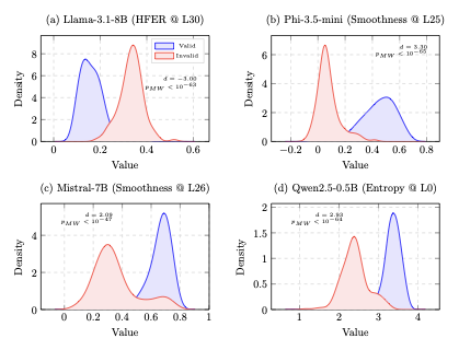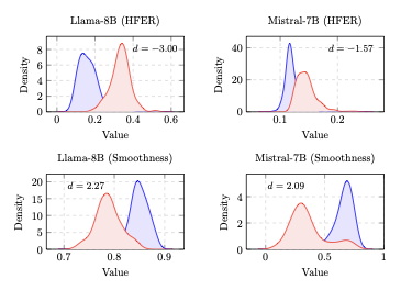 where the metric (typically HFER or Smoothness), layer $`\ell^*`$, direction, and threshold $`\tau`$ are calibrated on a small held-out set. We also examine two-feature rules combining metrics, which achieve marginally higher accuracy by capturing complementary information (4.4).