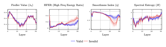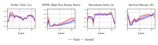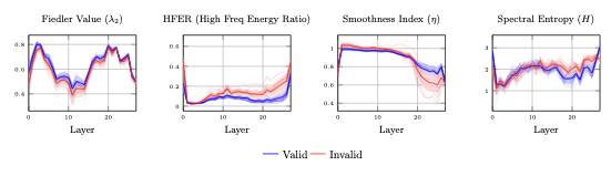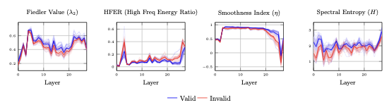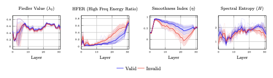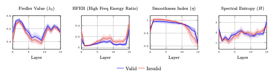 The application of spectral graph theory to neural networks has a rich history . Recent work has analyzed transformers through graph-theoretic lenses, studying over-smoothing , designing spectral attention mechanisms , and connecting attention to graph diffusion . analyzed attention entropy for calibration. Most recently, applied spectral filters to state-space models for long-context retrieval, while introduced network science analysis of attention in Graph Transformers. Our work differs in applying the full graph signal processing framework, including Laplacian eigenanalysis and spectral diagnostics, to validity detection in standard transformers, achieving classification effect sizes of $`d > 3.0`$.
