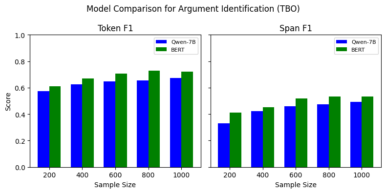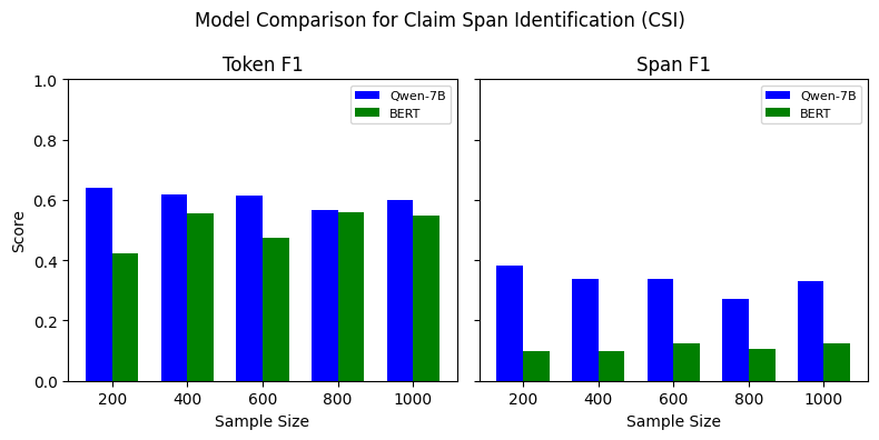 Our experiments indicate that, for the TBO, ABSA, and TSD tasks, BERT outperforms Qwen-7B model for all data sizes (See FigureĀ 7). The performance varies depending on the span type and number of training examples used, where it is comparable for some span types while substantial for the others. However, the SLM outperforms the LLM on CSI, especially on the span F1 score. This indicates that LLM identifies the exact claim spans more precisely than the smaller models. The findings suggest that SLMs generally outperform LLMs when fine-tuned with limited labeled training data. However, few-shot learning with LLMs can be leveraged in such scenarios due to its higher performance, as indicated in TablesĀ [tab:combined-results].