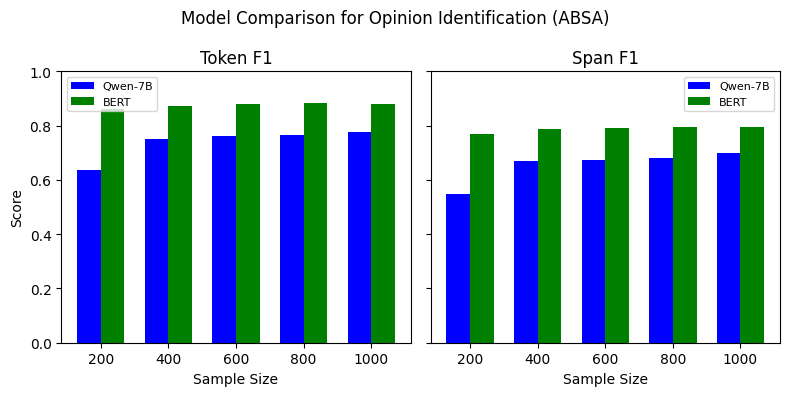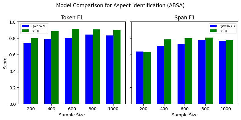 FigureĀ 7 shows the performance of Qwen-7B compared to BERT when trained with varying training data sizes. We perform this experiment to understand how LLMs perform in a low-resource setting. For the TBO and ABSA tasks, BERT outperform the Qwen-7B model. Similarly, for TSD, BERT outperforms Qwen-7B when fine-tuned with 200 instances, but as we increase the number of training instances, the F1 score difference decreases. Unlike the other three tasks, Qwen-7B outperforms BERT, with a substantial Span F1 difference between the two models. However, as we increase the training dataset, the difference in Token F1 for this task gradually decreases. The experiment indicates that the performance of SLMs and LLMs differs, considering the type of task.