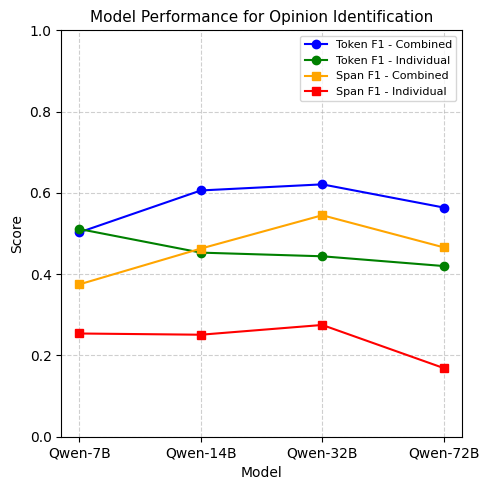Table [tab:combined-results] show the token-level and span-level F1 scores of the best-performing Llama and Qwen models for all the tasks (the performance of all other models is shown in TableĀ [tab:all-results]). For TBO and ABSA tasks, few-shot learning achieves the best performance, followed by instruction-tuned models. CoT is the least performing on both these tasks, however, the performance is comparable to zero-shot, in identifying the target and argument spans. However, for ABSA, identifying the aspect spans is more efficient in zero-shot setting compared to CoT.