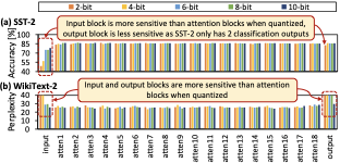 The input and output blocks are more sensitive than the attention blocks, since the loss of information from quantization in these blocks lead to notable performance degradation. Therefore, the input and output blocks should be carefully quantized to maximize memory reduction while ensuring high performance (e.g., accuracy).