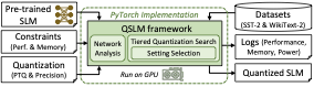 Key Results: We implement the QSLM framework using PyTorch and then run it on the Nvidia RTX A6000 multi-GPU machine. Experimental results show that QSLM provides effective quantization settings for SLMs. It saves by up to 86.5% of memory footprint, reduces by up to 20% of power consumption, and maintain high performance across different tasks (i.e., by up to 84.4% accuracy of sentiment classification on the SST-2 and 23.2 perplexity score of text generation on the WikiText-2) close to the non-quantized model, while meeting the performance and memory constraints. These results show the potential of QSLM framework for enabling embedded implementation of SLMs.