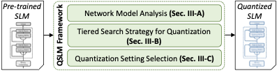 We propose the novel QSLM framework to solve the targeted problem and related challenges, whose overview is presented in Fig.Ā 5. It employs network model analysis to identify the model structure and identify its block sensitivity under quantization, tiered search strategy to systematically perform quantization on the model, and quantization setting selection that considers performance and memory constraints. Details of its key steps are discussed in the following sub-sections.