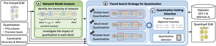 Tiered Search Strategy for Quantization (Sec.Ā 3.2): It aims to perform automated quantization and evaluation for the model candidates under different phases (e.g., global-, block-, and module-level quantization, subsequently) based on the network hierarchy and the sensitivity analysis, while considering the performance and memory constraints.