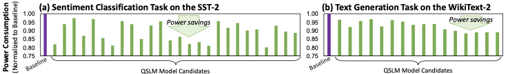 Experimental results for power consumption of the baseline model and the QSLM model candidates that meet both performance and memory constraints are provided in Fig.Ā 10. For the sentiment classification task, QSLM model candidates can reduce the power consumption by 2.6%-20%. Meanwhile, for the text generation task, QSLM model candidates can reduce the power consumption by 3.2%-11.6%. These power savings come from the reduction of precision levels in the weight parameters of the quantized models, thereby incurring lower computational and memory power to complete the processing, as compared to the baseline non-quantized model. Furthermore, these results also demonstrate that, QSLM effectively optimizes power consumption, while meeting both performance and memory constraints (i.e., $`const_A`$ and $`const_M`$).