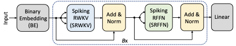 SRWKV leverages element-wise products rather than matrix-matrix multiplication, hence reducing the computational cost of the attention mechanism. Meanwhile, SRFFN is employed to replace the conventional feed-forward network (FFN) with a spiking-compatible version. Its network architecture is illustrated in Fig.Ā 4 and summarized in TableĀ 13. If the data have been processed through all network layers, the model either employs a classification head for natural language understanding (NLU) or a generation head for natural language generation (NLG).