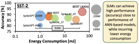 SLMs: Recently, several state-of-the-art SLMs have been proposed in the literature, such as SpikeBERTĀ , SpikingBERTĀ , SNN-BERTĀ , SpikeLMĀ , SpikeLLMĀ , and SpikeGPTĀ . In this work, we consider SpikeGPT as the potential model candidate for embedded systems since it offers competitive performance with the lowest energy consumption due to its reduced computational complexity; see Fig.Ā 1. Specifically, SpikeGPT replaces traditional self-attention mechanism with Spiking Receptance Weighted Key Value (SRWKV) and Spiking Receptance Feed-Forward Networks (SRFFN).