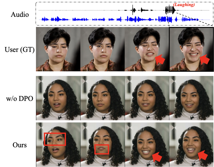 In contrast, our fine-tuned model generates an expressive avatar that shows natural head movement (11 red box) and smiles more broadly along with the user (11 red arrow). We provide further analysis of our DPO method in AppendixĀ D.