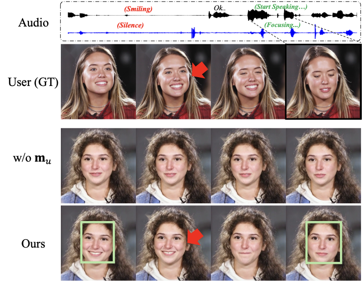 Furthermore, as visualized inĀ 10, the model without user motion produces static behavior whenever the userās audio is silent. This occurs even in the presence of strong non-verbal cues, such as smiling, as the model cannot perceive visual signals. In contrast, our model, which uses user motion, generates a reactive avatar that naturally smiles right after the user smiles (10 red arrow) and becomes more focused when the user speaks (10 green box).