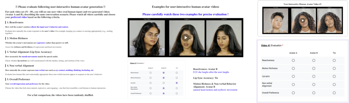 We conduct a human preference study comparing our model with the interactive head avatar generation model INFP*. We recruited 22 participants to evaluate 8 video sets using five perceptual metrics: Reactiveness measures how well the avatar reacts to user motion and audio, Motion Richness evaluates expressiveness of the avatar motion, Verbal Alignment evaluates the lip synchronization with the audio, Non-verbal Alignment assesses the non-verbal behaviors such as eye contact or nodding, and Overall Preference. We provide further details of the human study in the supplementary materials.