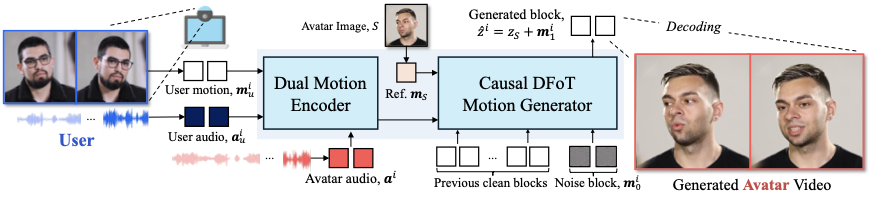 where each motion latent $`\mathbf{m}^i`$ is predicted from past motion latents and the condition triplet $`\mathbf{c}^{i} = (\mathbf{a}_u^{i}, \mathbf{m}_u^i, \mathbf{a}^i)`$ consisting of user audio $`\mathbf{a}_u^{i}`$, user motion $`\mathbf{m}_u^i`$, and avatar audio $`\mathbf{a}^i`$.