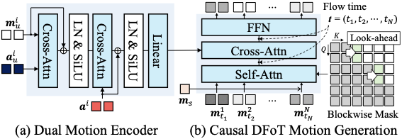 For the causal motion generator, we adopt the diffusion forcing transformer (DFoT)Ā with a blockwise causal structureĀ . The latent frames are divided into blocks to capture local bidirectional dependencies within each block while maintaining causal dependencies across different blocks. For each block, we assign a shared noise timestep to all frames and apply an attention mask that prevents the current block from attending to any future blocks.